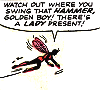 Description: Jan flying. Text: "Watch out where you swing that hammer, Golden Boy! There's a lady present!"